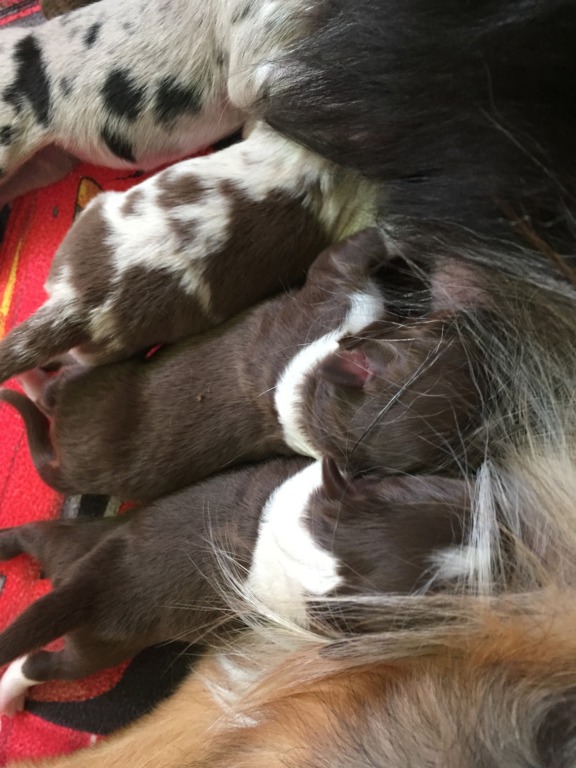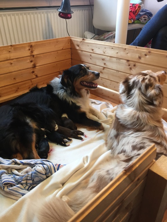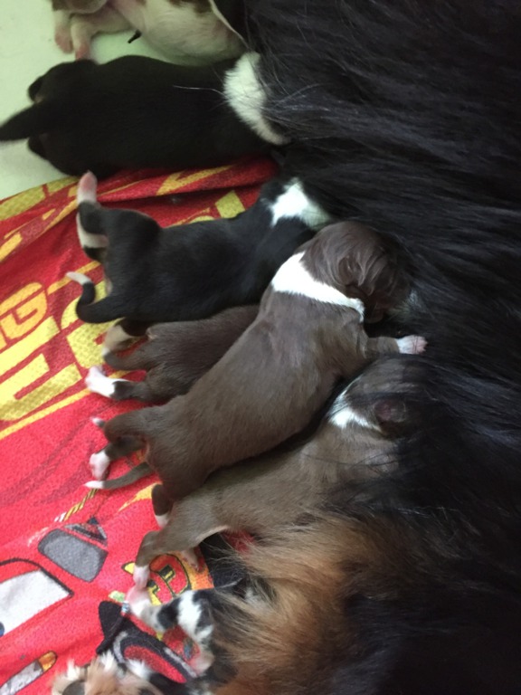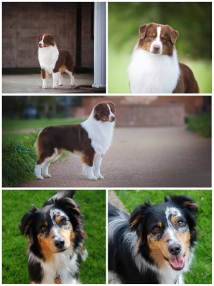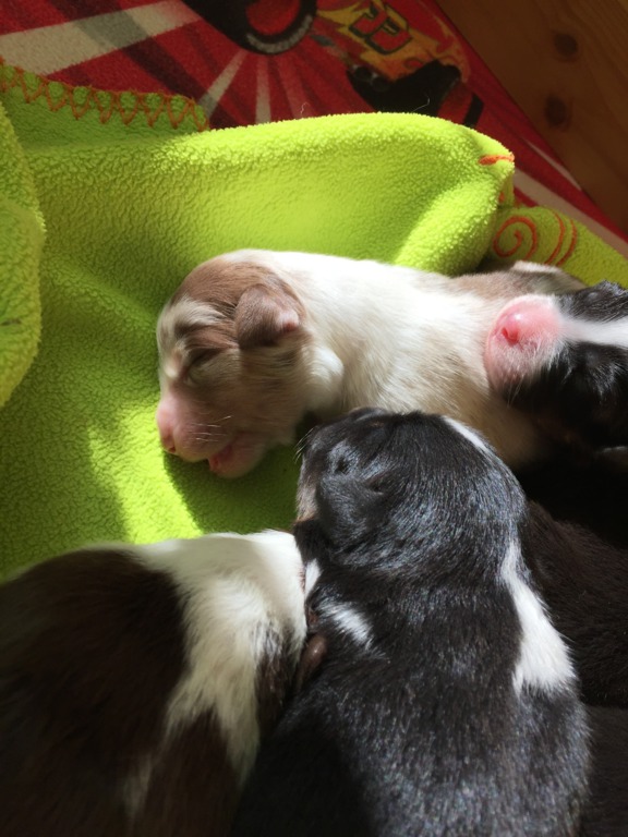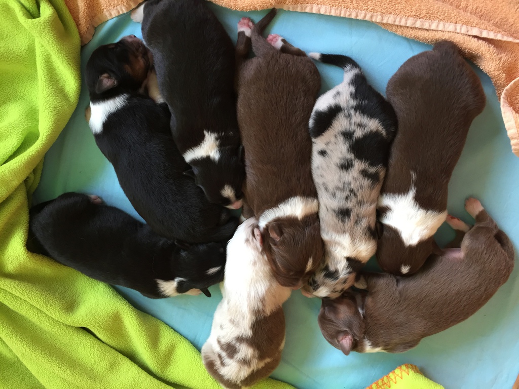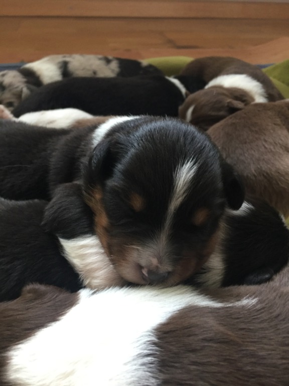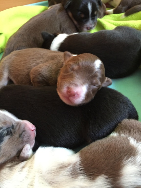 sechs Hündinnen, 1x black tri, 3x red tri, 1x blue merle, 1x red merle