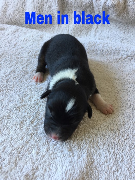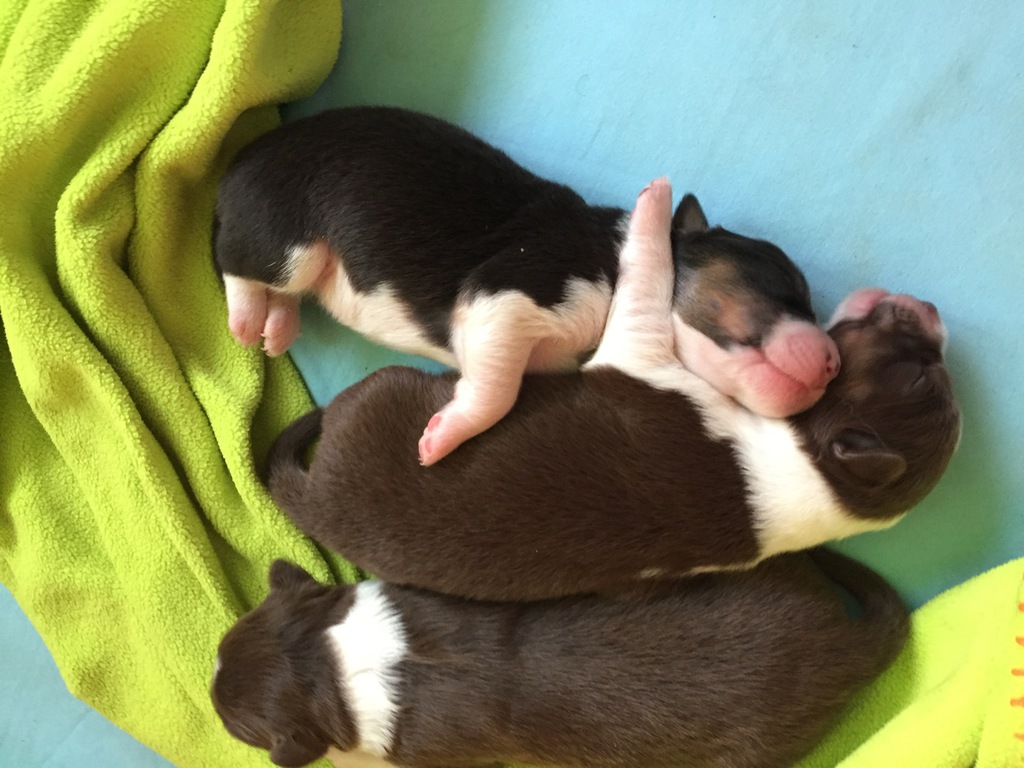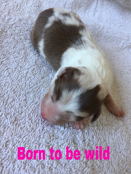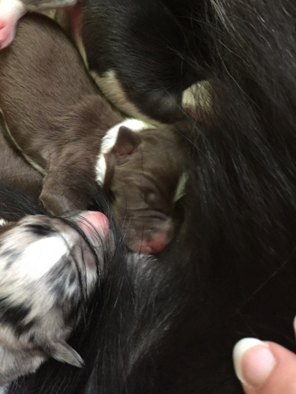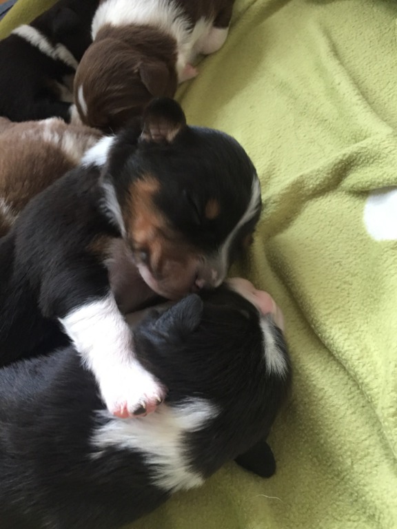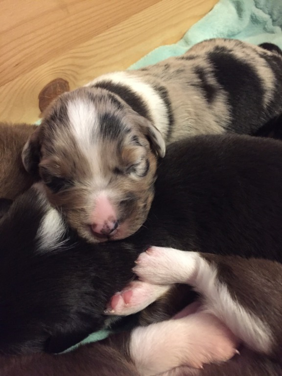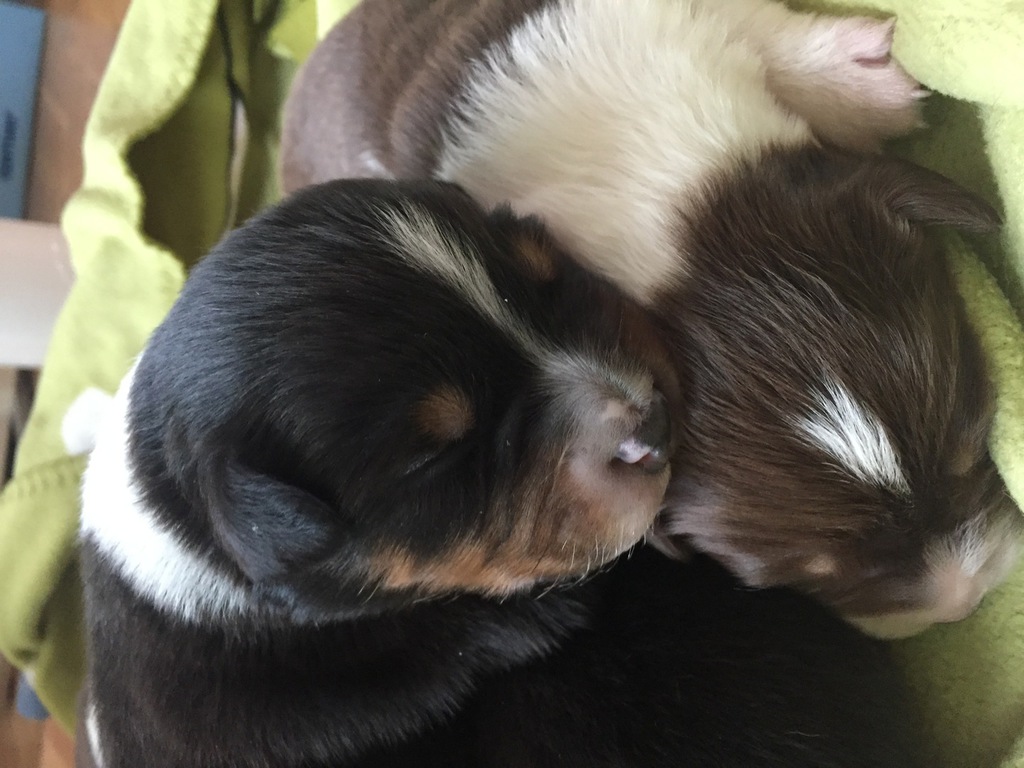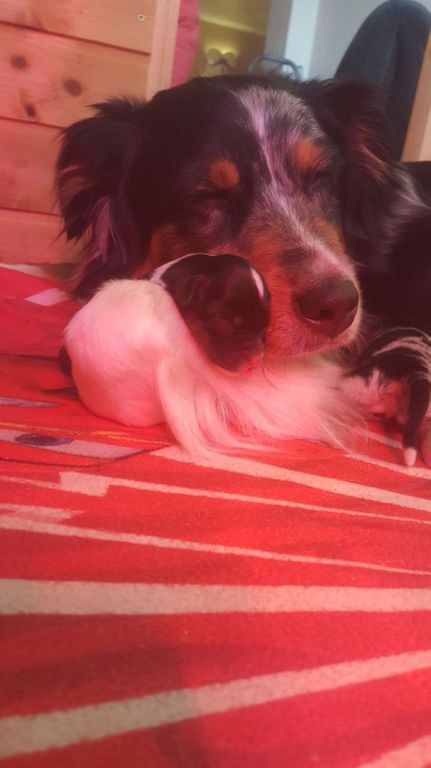 sechs Hündinnen, 1x black tri, 3x red tri, 1x blue merle, 1x red merle